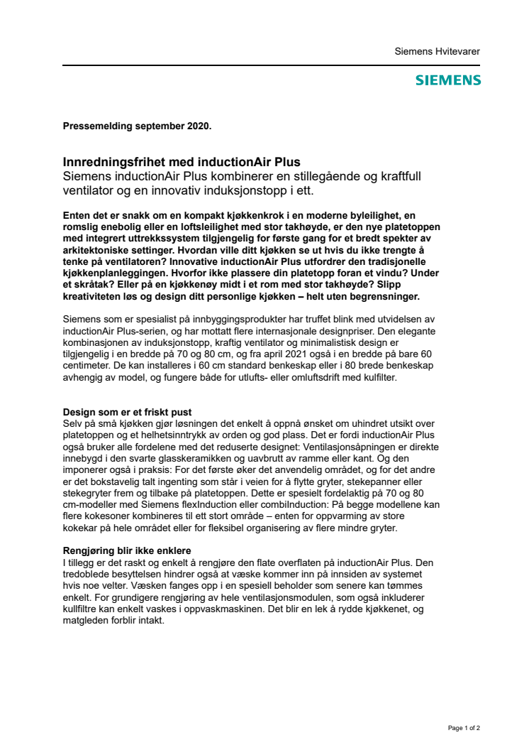 Innredningsfrihet med Siemens inductionAir Plus
