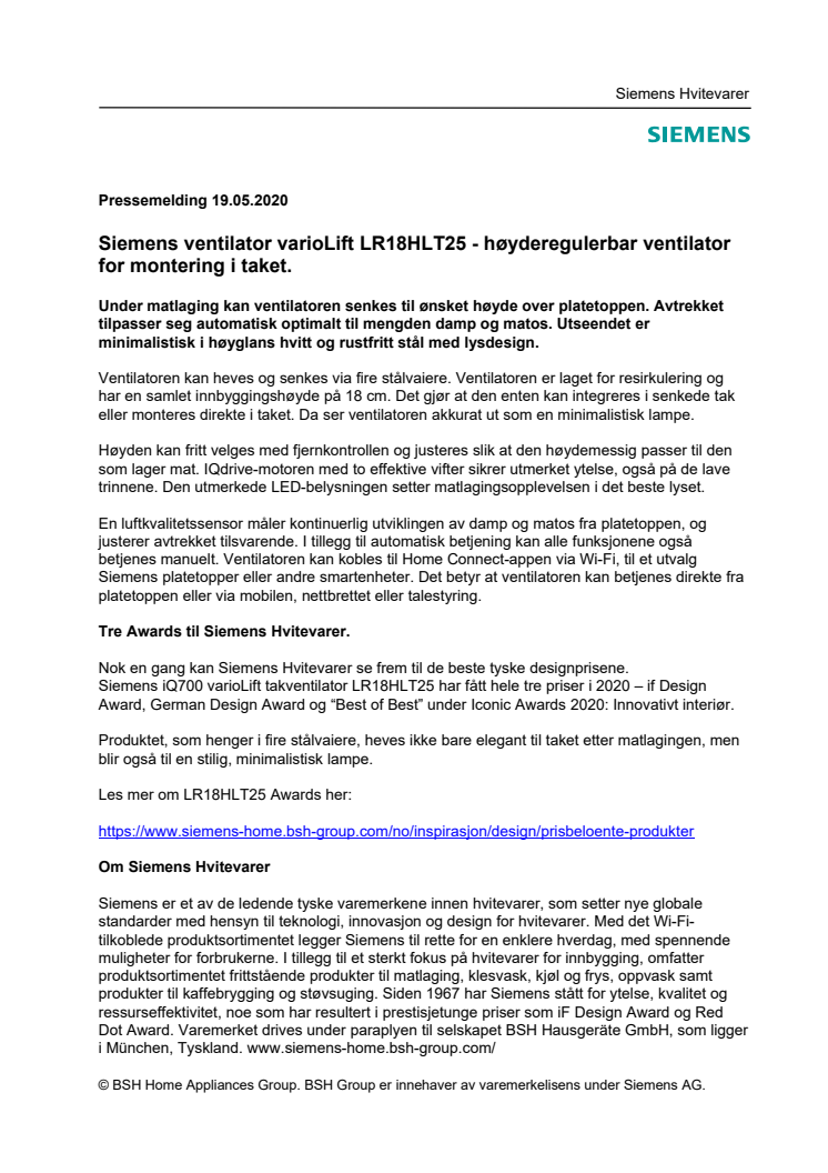 Siemens ventilator varioLift LR18HLT25 - høyderegulerbar ventilator for montering i taket.