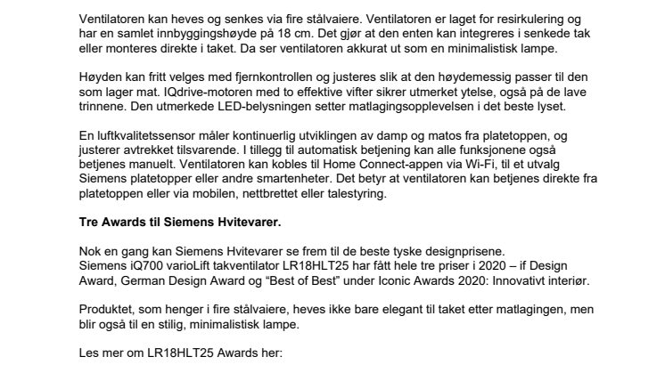Siemens iQ700 varioLift takventilator LR18HLT25 har fått hele tre priser i 2020 – if Design