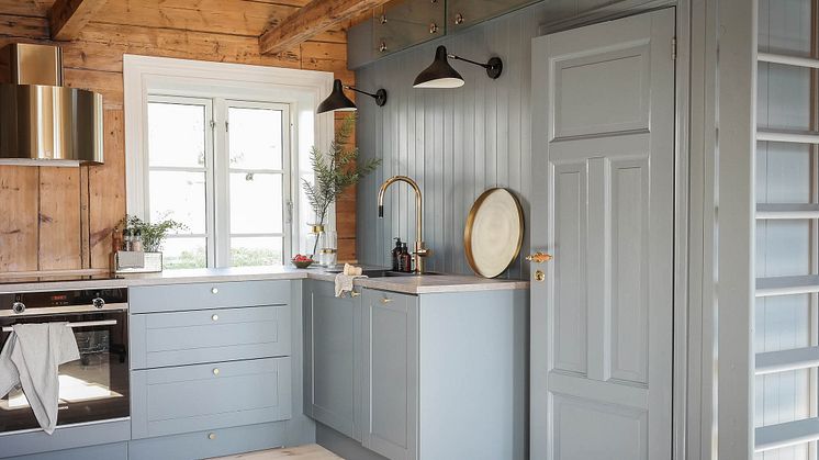 – Den isblå fargen som er brukt på kjøkkenet på Frei for eksempel er inspirert av sjøen som er rett utenfor hytta. Messingkrana skal ta opp det gylne i tømmeret, forklarer Kristin.