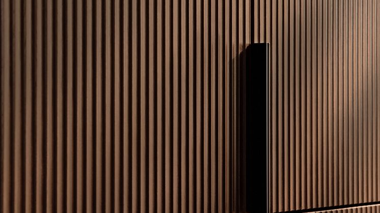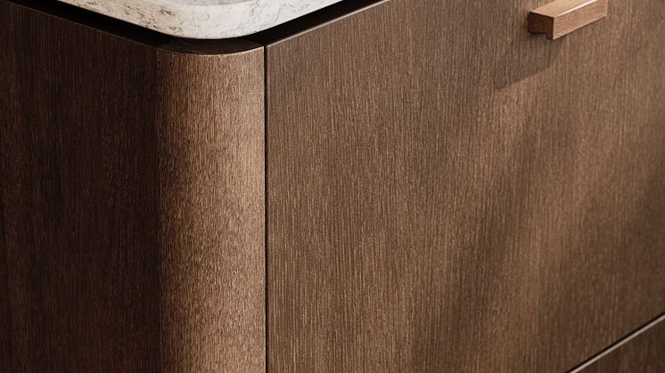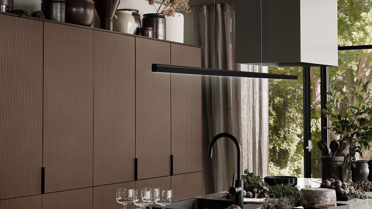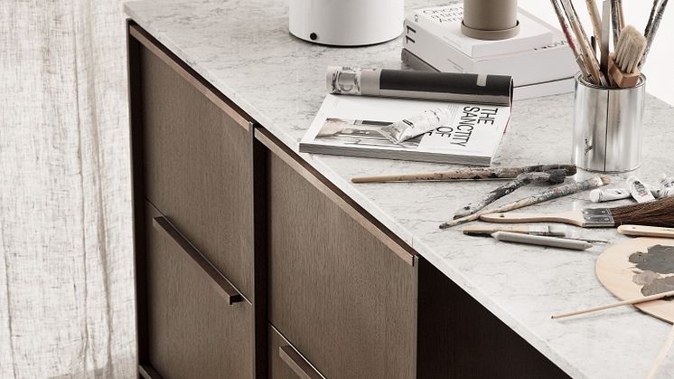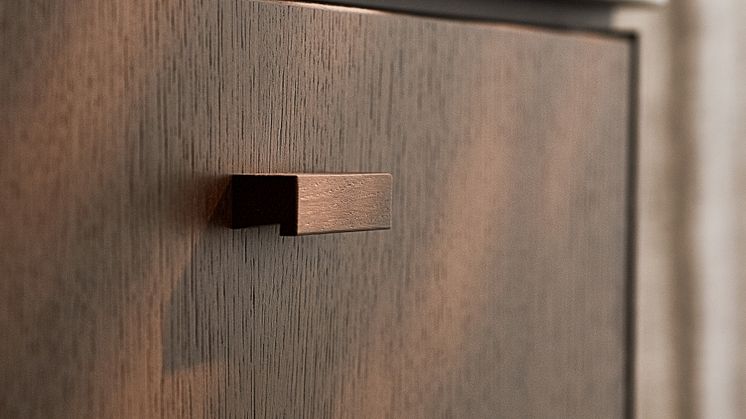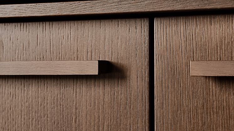På listen over valgmulighetene av håndtak, rammer og benkeplater, finner vi blant annet en ny grepserie i brunbeiset eik. Et diskret håndtak som kan fås i åtte ulike størrelser.
