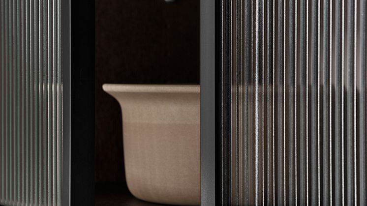 I tillegg har Sigdal designet en vitrinefront med rillet glass som fremhever detaljene og gir kjøkkenet et personlig preg. Glasset er rammet inn av en tynn, svart aluminiumramme, med sorte hengsler som gir et jevnt og sammenhengende uttrykk. Denne kan fås i ulike størrelser.