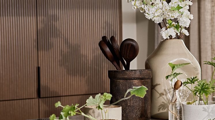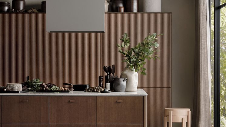 Nyheten Favn, er en vakker brunbeiset eikedør med stående finér som gir liv til hele kjøkkenet. Beisfargen har fått navnet Nøtt. Vi lanserer også flere ulike skaprammer som tilfører kjøkkenet en vakker møbelfølelse med tydelige linjer.