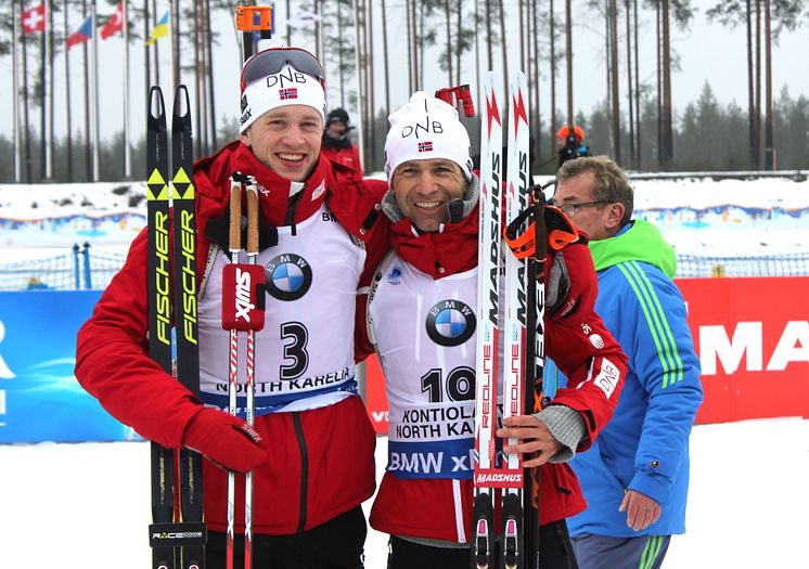 Tarjei Bø og Ole Einar Bjørndalen etter jaktstarten, VM i Kontiolahti 2015