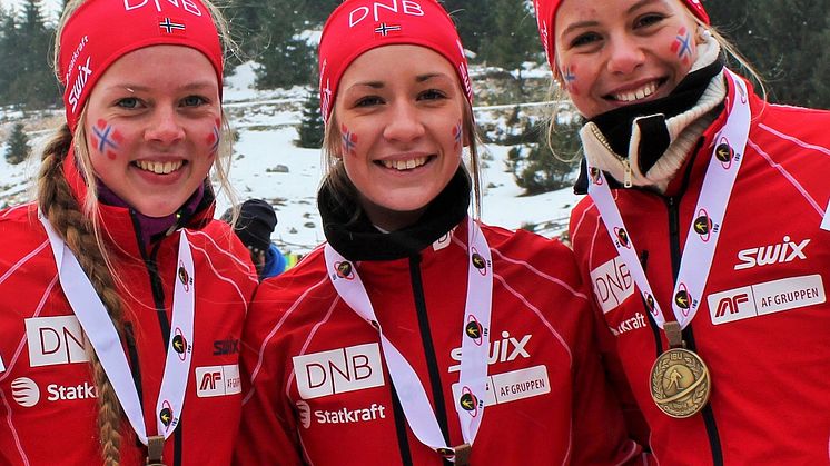 De norske jentene tok gull på stafetten for junior kvinner i VM i dag.