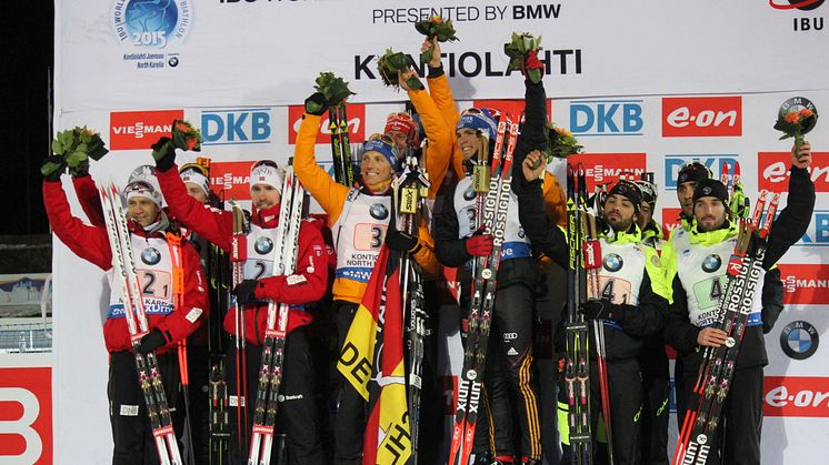 Ole Einar Bjørndalen åpnet med en knalletappe og sendte Tarjei Bø ut i ledelsen. Tarjei hadde litt mer trøbbel på standplass, men etter siste stående dro han til slik at Norge fortsatt var med i kampen om medalje. Johannes Thingnes Bø hang lett på Tyskland, men med etter et par bom på siste stående ble avstanden til Tyskland større. Emil Hegle Svendsen gikk også en god etappe,men han klarte desverre aldri å ta igjen Schemp og dermed tok Tyskland gullet. Franske Martin Fourcade gikk svært raskt på siste etappe, men Hegle Svendsen hadde god kontroll og han kom seg aldri forbi.
