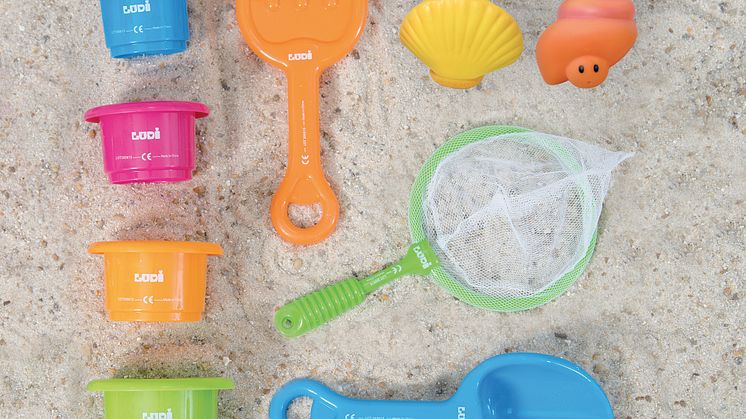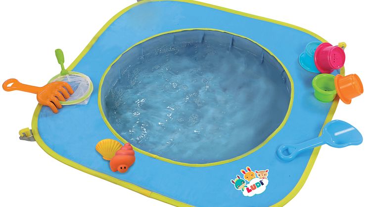 Strandsettet inneholder også ni strandleker; spade, rake, håv, fire små kopper i ulike størrelser og to snegleformede badeleker, som kan sprute vann. Lekene og bassenget kommer pakket i en liten veske som er lett å ta med seg, i tillegg til at den får plass under en barnevogn.