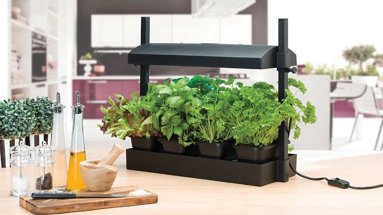 Det allsidige bordformatet gjør innendørsdrivbenken enkel å plassere. Og etter at du har plantet i de små dyrkekassene og fylt på med vann, er innendørsdrivbenken enkel å vedlikeholde og selvgående. Avhengig av klimaet (varme, kulde, soleksponering osv.), sørger innendørsdrivbenken for opptil 14 dagers selvvanning.