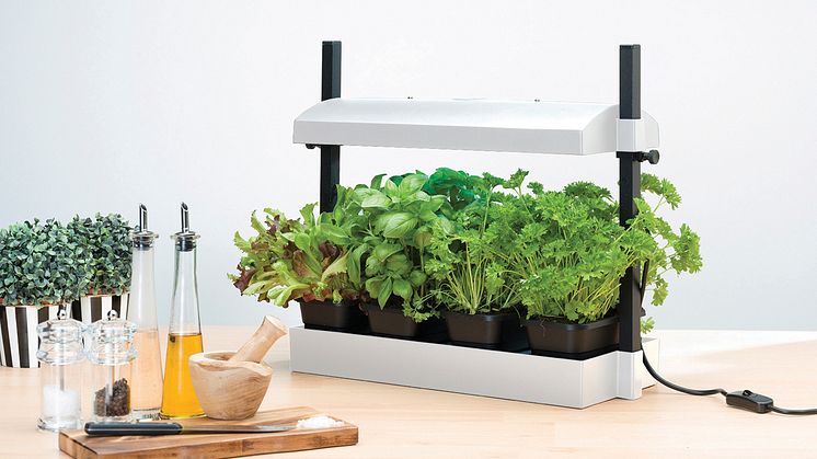 Praktisk innendørs drivbenk som passer perfekt for såing og innendørsdyrking. Den forlenger også holdbarheten på ferske krydderurter som du kjøper i butikken. Belysningen etterligner ekte sollys og gir plantene det lyset de trenger for å trives, selv på de mørkeste årstidene.