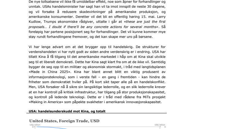 De nye tollsatsene vil ikke få umiddelbar effekt, noe som åpner for forhandlinger og unntak. USAs handelsminister har sagt han vil ta imot innspill de neste 30 dagene, og vil forsøke å redusere skadevirkninger på amerikanske produksjon, og amerikanske konsumenter. Deretter vil det bli en offentlig høring 15. mai. Larry Kudlow, Trumps økonomiske rådgiver, uttalte i går at «these are just the first proposals… I doubt if there’ll be any concrete actions for several months». Så foreløpig har partene posisjonert seg for forhandlinger. Det vil kunne kommer mye støy rundt forhandlingene fremover, og det kan skape mer uro på børsene.