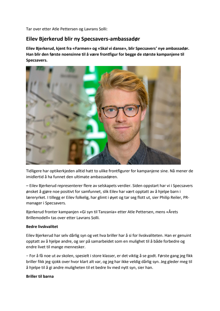 Eilev Bjerkerud, kjent fra «Farmen» og «Skal vi danse», blir Specsavers’ nye ambassadør. Han blir den første noensinne til å være frontfigur for begge de største kampanjene til Specsavers.