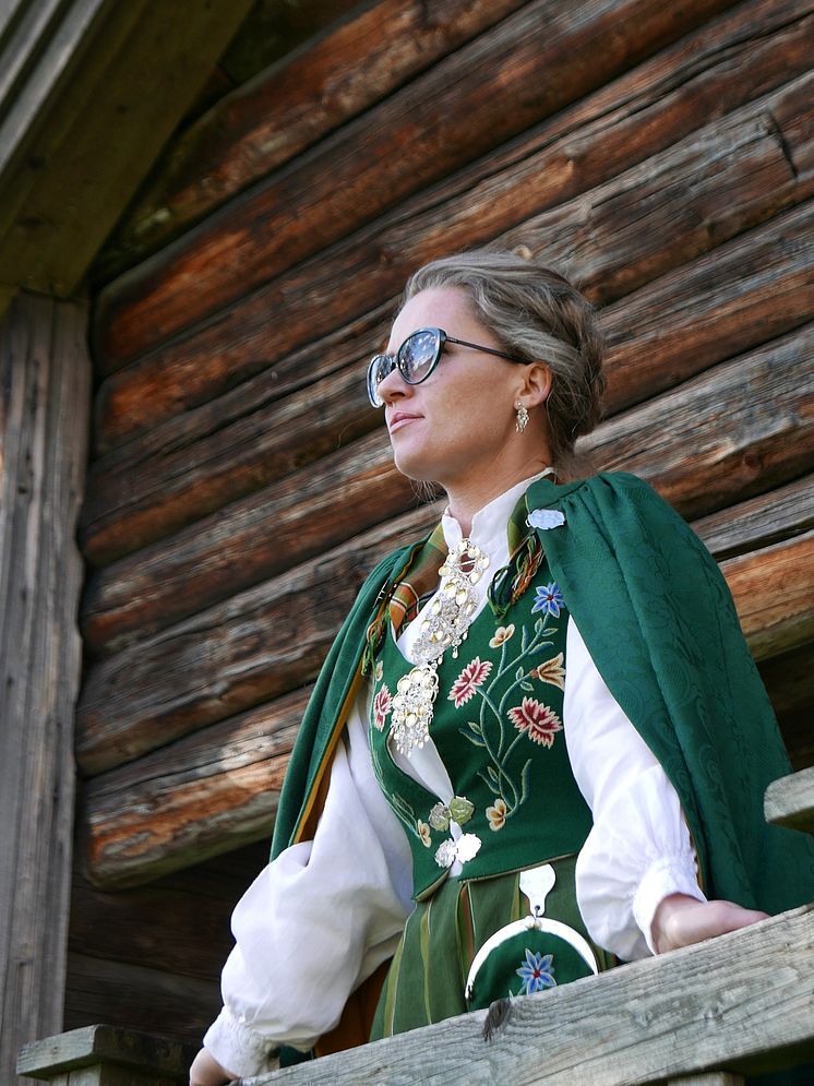 Stine Westlund i Specsavers, styler sin Nordlandsbunad med en diskré brille i en grønntone som kler bunaden. Foto Christer Folke Westlund.