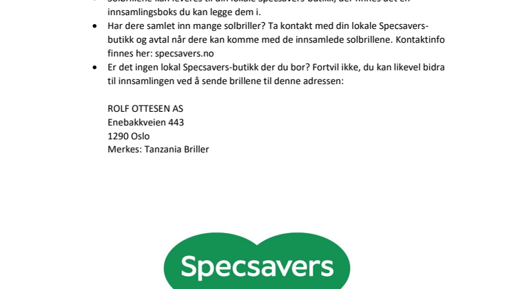 Slik bidrar du: lever dine brukte solbriller hos din lokale Specsavers-butikk. Se vedlegg for mer informasjon.