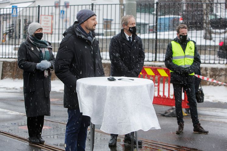 Kronprinsen besøker ansatte i Sporveien, på Holtet trikkebase, og får fremvist en av Oslos nye trikker