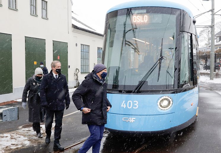 Kronprinsen besøker ansatte i Sporveien, på Holtet trikkebase, og får fremvist en av Oslos nye trikker