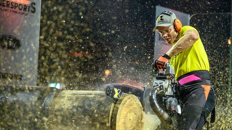 Bilde 5: Ferry Svan var den nest raskeste i disiplinen Hot Saw og sagde gjennom den 46 cm tykke tømmerstokken på kun 7,31 sekunder. Bilde: STIHL TIMBERSPORTS®.