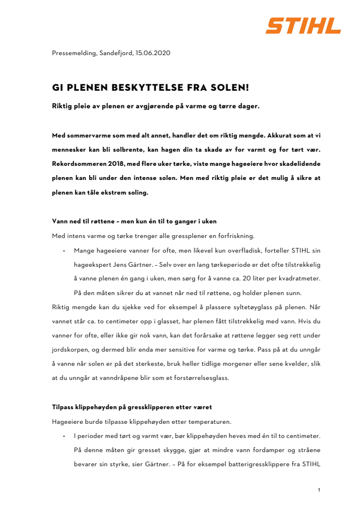 Med sommervarme som med alt annet, handler det om riktig mengde. Akkurat som at vi mennesker kan bli solbrente, kan hagen din ta skade av for varmt og for tørt vær. Rekordsommeren 2018, med flere uker tørke, viste mange hageeiere hvor skadelidende plenen kan bli under den intense solen. Men med riktig pleie er det mulig å sikre at plenen kan tåle ekstrem soling.