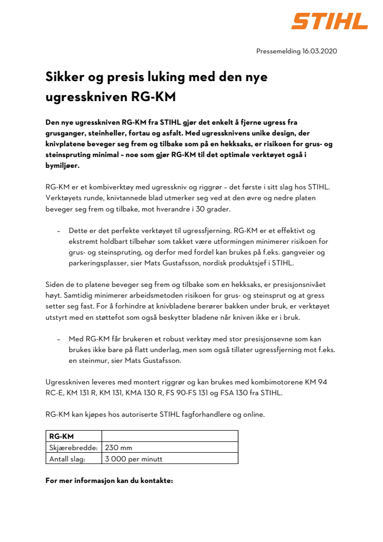 Den nye ugresskniven RG-KM fra STIHL gjør det enkelt å fjerne ugress fra grusganger, steinheller, fortau og asfalt. Med ugressknivens unike design, der knivplatene beveger seg frem og tilbake som på en hekksaks, er risikoen for grus- og steinspruting minimal – noe som gjør RG-KM til det optimale verktøyet også i bymiljøer.