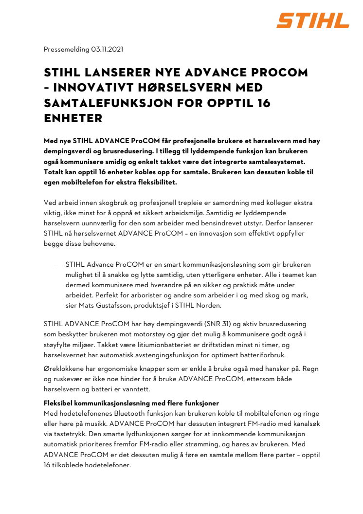 STIHL LANSERER NYE ADVANCE PROCOM – INNOVATIVT HØRSELSVERN MED SAMTALEFUNKSJON FOR OPPTIL 16 ENHETER .pdf