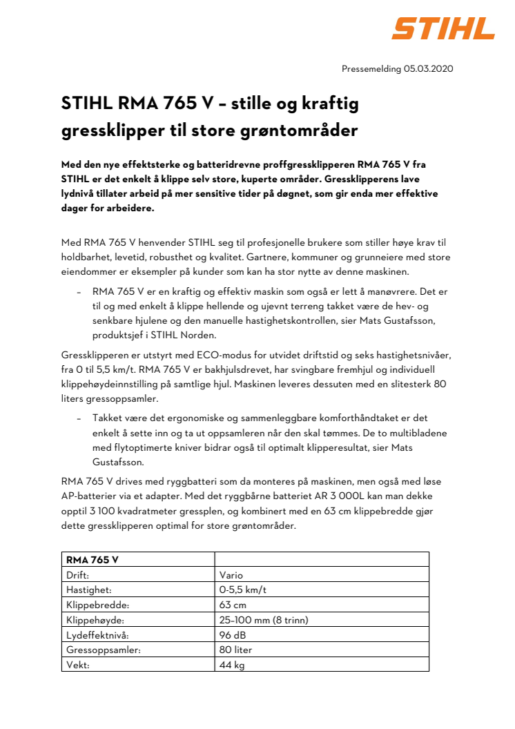 STIHL RMA 765 V – stille og kraftig gressklipper til store grøntområder