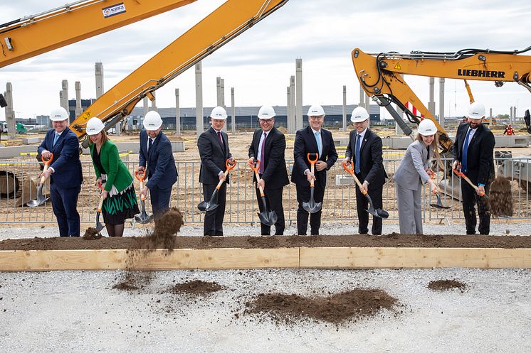Symbolsk banebrytende seremoni for et nytt batteriproduksjonsanlegg i Romania: (fra venstre) Michael Traub, styreleder i STIHL, Alina Silaghi, administrerende direktør ADLO, Florin Birta, ordfører i Oradea, Dr. Nikolas Stihl, styreleder i STIHL, Martin Schwarz, STIHL-styremedlem for produksjon og materialhåndtering, Dr. Michael Prochaska, STIHLs styremedlem for HR og juridiske saker, Dr. Robert Feulner, CEO ANDREAS STIHL POWER TOOLS S.R.L. Romania, Noemi Straub, leder for økonomi, HR og IT Andreas Stihl Power Tools S.r.l. Romania, Attila Puskás, direktør Kész Romania.