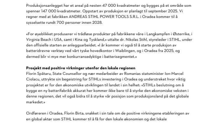 «For øyeblikket produserer vi trådløse produkter på fabrikkene våre i Langkampfen i Østerrike, i Virginia Beach i USA, samt i Kina og Tyskland,» uttalte dr. Nikolas Stihl, styreleder i STIHL, under den offisielle starten av anleggsarbeidet. «I år kommer vi også til å starte produksjon av batteridrevne verktøy ved vårt tyske hovedkontor i Waiblingen, og i Oradea fra 2025, og dermed blir vi mye mer konkurransedyktige i batterisegmentet.»