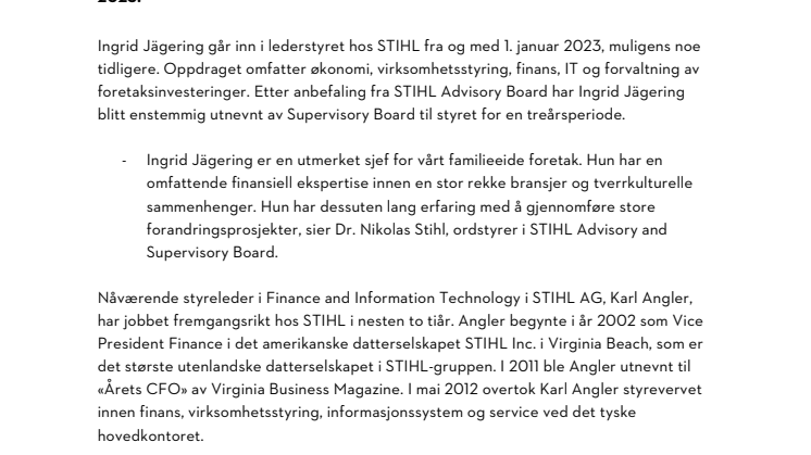 Ingrid Jägering utnevnes som nytt styremedlem for Finance and Information Technology hos STIHL AG. Hun overtar etter Karl Angler, som forlater foretaket i forbindelse med at styrekontrakten hans løper ut og han fyller 66 år i slutten av 2022. Det innebærer at styret består av 50 prosent kvinner fra og med 1. januar 2023.