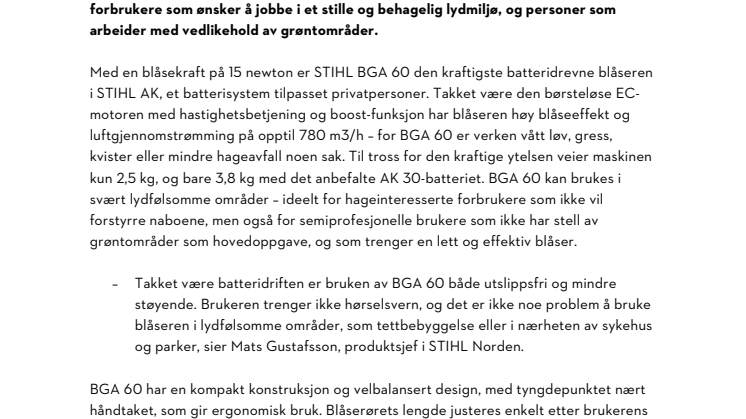 – Takket være batteridriften er bruken av BGA 60 både utslippsfri og mindre støyende. Brukeren trenger ikke hørselsvern, og det er ikke noe problem å bruke blåseren i lydfølsomme områder, som tettbebyggelse eller i nærheten av sykehus og parker, sier Mats Gustafsson, produktsjef i STIHL Norden.