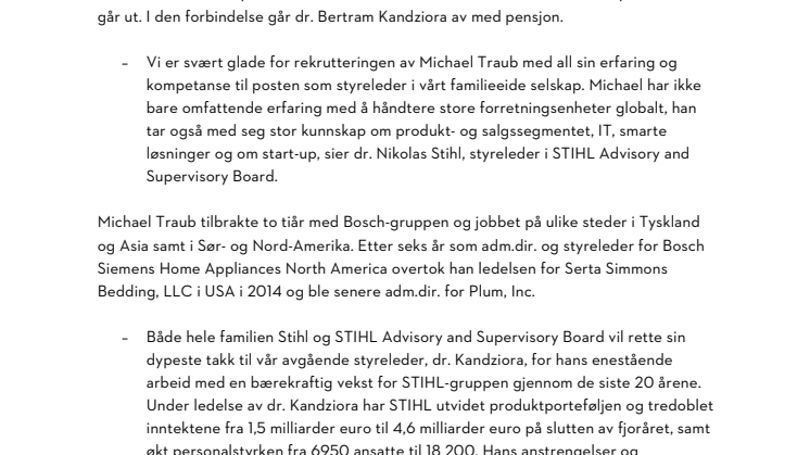 – Vi er svært glade for rekrutteringen av Michael Traub med all sin erfaring og kompetanse til posten som styreleder i vårt familieeide selskap. Michael har ikke bare omfattende erfaring med å håndtere store forretningsenheter globalt, han tar også med seg stor kunnskap om produkt- og salgssegmentet, IT, smarte løsninger og om start-up, sier dr. Nikolas Stihl, styreleder i STIHL Advisory and Supervisory Board.