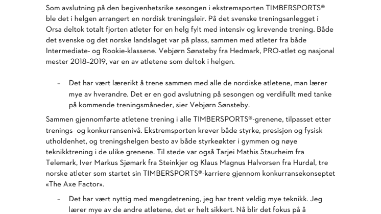 Som avslutning på den begivenhetsrike sesongen i ekstremsporten TIMBERSPORTS® ble det i helgen arrangert en nordisk treningsleir. På det svenske treningsanlegget i Orsa deltok totalt fjorten atleter for en helg fylt med intensiv og krevende trening. Både det svenske og det norske landslaget var på plass, sammen med atleter fra både Intermediate- og Rookie-klassene. Vebjørn Sønsteby fra Hedmark, PRO-atlet og nasjonal mester 2018–2019, var en av atletene som deltok i helgen.