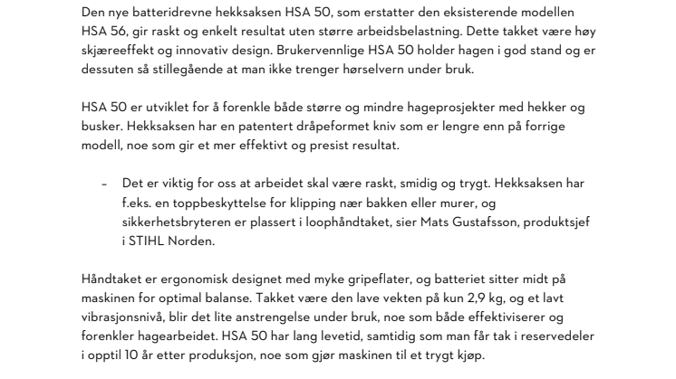 Den nye batteridrevne hekksaksen HSA 50, som erstatter den eksisterende modellen HSA 56, gir raskt og enkelt resultat uten større arbeidsbelastning. Dette takket være høy skjæreeffekt og innovativ design. Brukervennlige HSA 50 holder hagen i god stand og er dessuten så stillegående at man ikke trenger hørselvern under bruk.