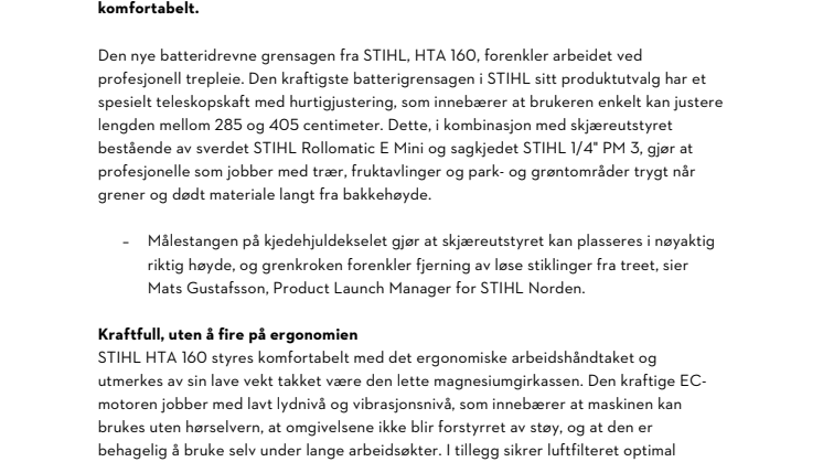 Nå lanseres STIHL HTA 160, en batteridrevet grensag til profesjonell trepleie. Grensagen, som er den kraftigste innenfor batterisegmentet til STIHL, muliggjør effektiv og presis kapping på høye høyder. I tillegg til ytelsen utmerker HTA 160 seg også når det gjelder ergonomien. Lavt vibrasjonsnivå, lavt driftslydnivå og arbeidshåndtak utstyrt med LED-display er detaljer som gjør arbeidet mer komfortabelt.