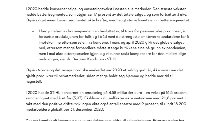 Driftsåret 2020 resulterte i en omsetning på 4,58 milliarder euro for STIHL-konsernet, en økning på 16,5 prosent sammenlignet med 2019. Antall ansatte økte også, og globalt har STIHL nå ca. 18 200 medarbeidere. Den positive utviklingen forventes å fortsette i 2021 – ikke minst takket være mange nye produkter.