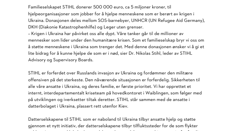 Familieselskapet STIHL donerer 500 000 euro, ca 5 miljoner kroner, til hjelpeorganisasjoner som jobber for å hjelpe menneskene som er berørt av krigen i Ukraina. Donasjonen deles mellom SOS-barnebyer, UNHCR (UN Refugee Aid Germany), DKH (Diakonie Katastrophenhilfe) og Leger uten grenser.