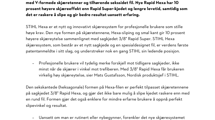 – Profesjonelle brukere vil tydelig merke forskjell mot tidligere sagkjeder, ikke minst når de skjærer i vinkel mot trefiberen. Med 3/8" Rapid Hexa får brukeren virkelig høy skjæreytelse, sier Mats Gustafsson, Nordisk produktsjef i STIHL.