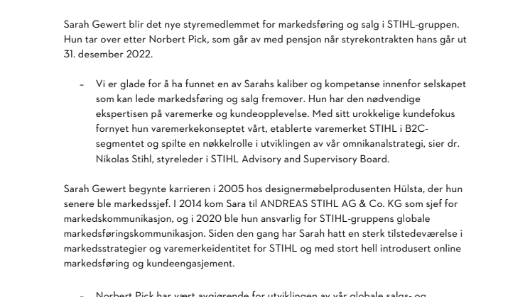 – Vi er glade for å ha funnet en av Sarahs kaliber og kompetanse innenfor selskapet som kan lede markedsføring og salg fremover. Hun har den nødvendige ekspertisen på varemerke og kundeopplevelse. Med sitt urokkelige kundefokus fornyet hun varemerkekonseptet vårt, etablerte varemerket STIHL i B2C-segmentet og spilte en nøkkelrolle i utviklingen av vår omnikanalstrategi, sier dr. Nikolas Stihl, styreleder i STIHL Advisory and Supervisory Board.