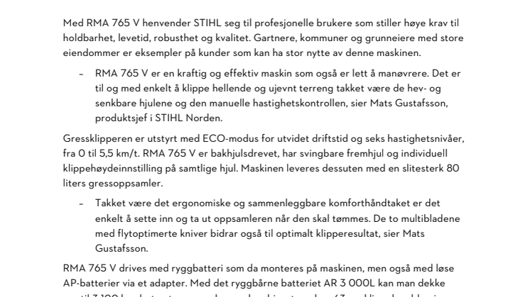 Med RMA 765 V henvender STIHL seg til profesjonelle brukere som stiller høye krav til holdbarhet, levetid, robusthet og kvalitet. Gartnere, kommuner og grunneiere med store eiendommer er eksempler på kunder som kan ha stor nytte av denne maskinen.