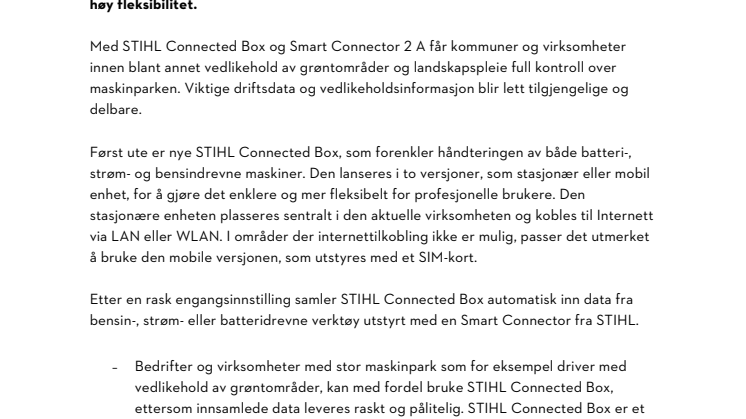 Med STIHL Connected Box og Smart Connector 2 A får kommuner og virksomheter innen blant annet vedlikehold av grøntområder og landskapspleie full kontroll over maskinparken. Viktige driftsdata og vedlikeholdsinformasjon blir lett tilgjengelige og delbare.