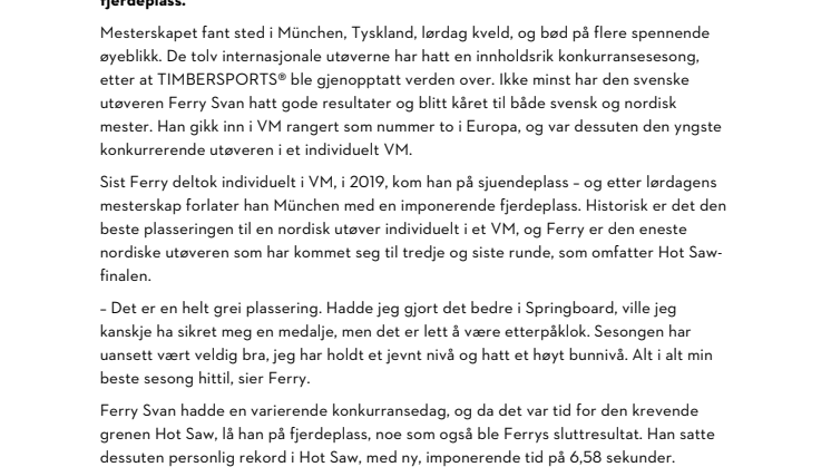 Mesterskapet fant sted i München, Tyskland, lørdag kveld, og bød på flere spennende øyeblikk. De tolv internasjonale utøverne har hatt en innholdsrik konkurransesesong, etter at TIMBERSPORTS® ble gjenopptatt verden over. Ikke minst har den svenske utøveren Ferry Svan hatt gode resultater og blitt kåret til både svensk og nordisk mester. Han gikk inn i VM rangert som nummer to i Europa, og var dessuten den yngste konkurrerende utøveren i et individuelt VM.