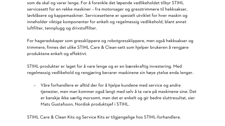 – Våre forhandlere er alltid der for å hjelpe kundene med service og andre tjenester, men man kommer også langt med selv å ta vare på maskinene sine. Det er kanskje ikke særlig morsomt, men det er enkelt og gir bedre sluttresultat, sier Mats Gustafsson, Nordisk produktsjef i STIHL.