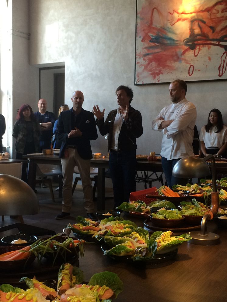Robert Holand, hotelldirektør på Comfort Hotel Grand Central, Petter Stordalen, eier i Nordic Choice Hotels og Ole Johnny Eikefjord, kjøkkensjef.