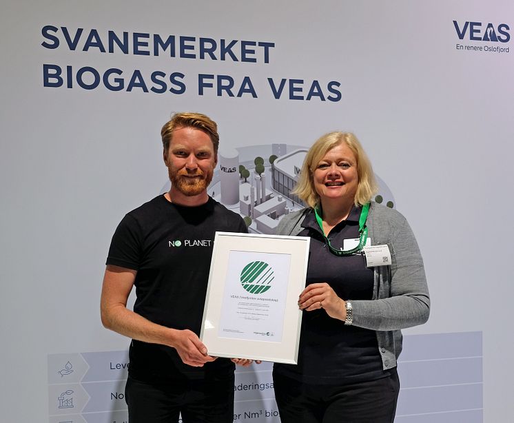 Bjørn Olav Aarø Strandli overrekker beviset for at VEAS har lisens på å produsere svanemerket biodrivstoff til Ragnhild Borchgrevink, administrerende direktør i VEAS.