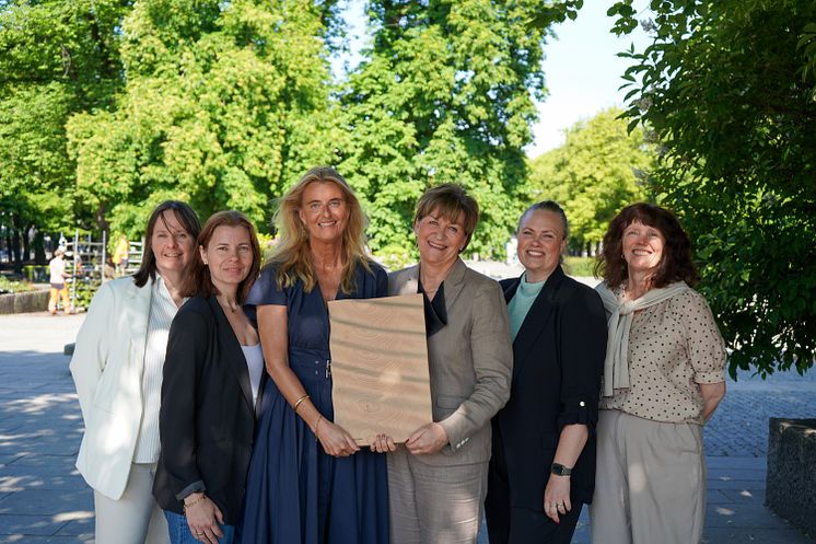 Den norske sengeprodusenten Jensen er vinner av Svaneprisen 2024. Fra venstre: Birgit Fonnesbæk Andersen, innkjøper i Jensen, Kristine Sylling, Category Manager i Jensen, Cathrine Pia Lund, administrerende direktør i Svanemerket, Marit Haukelidsæter, kvalitet og bærekraftssjef i Jensen, Marie Watten Eisenhardt, Industrial Designer i Jensen, Nina Stordalen, Marketing Manager i Jensen