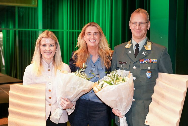 Fra venstre: Stine Fjærli Sjøthunsom, avdelingsdirektør i Forsvarsbygg, Cathrine Pia Lund, administrerende direktør i Miljømerking Norge, Øyvind Kvalvik, generalmajor og assisterende direktør i Forsvarsmateriell.