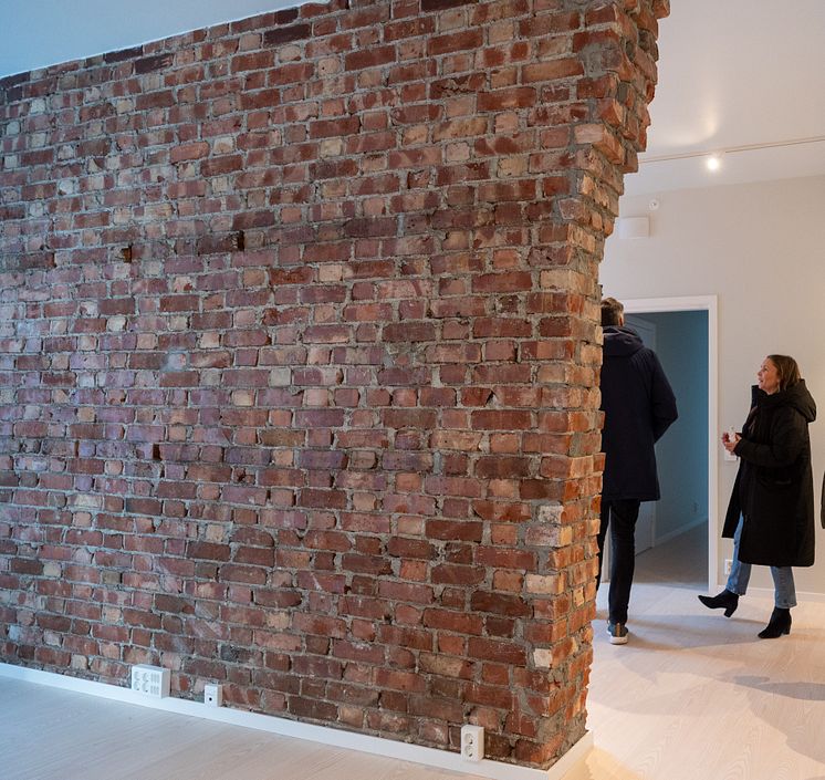 Flere av de gamle veggene har kommet frem og gir leilighetene et særpreg.