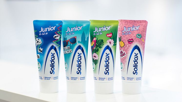 Barne- og juniortannkrem fra Solidox er fri for det sulfatholdige skummemiddelet SLS, og inneholder istedenfor et mildere skummemiddel som er skånsomt mot munnens naturlige miljø. Tannkremene har heller ingen konserveringsmidler som er klassifisert som allergifremkallende, og ingen mikroplast.