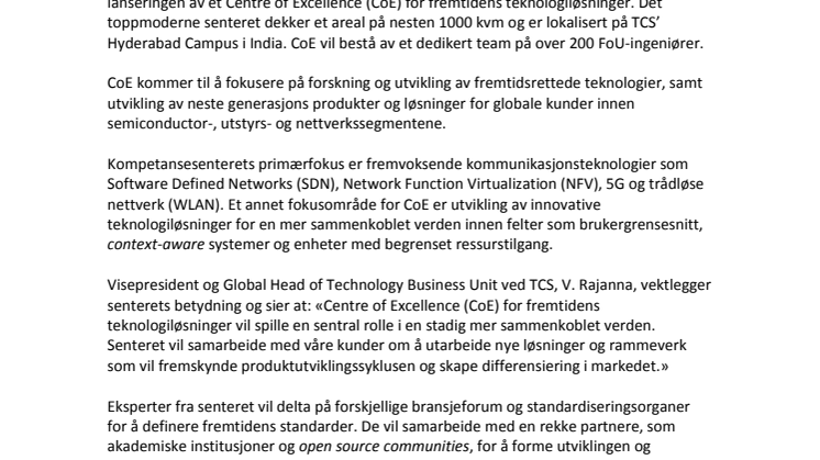 Visepresident og Global Head of Technology Business Unit ved TCS, V. Rajanna, vektlegger senterets betydning og sier at: «Centre of Excellence (CoE) for fremtidens teknologiløsninger vil spille en sentral rolle i en stadig mer sammenkoblet verden. Senteret vil samarbeide med våre kunder om å utarbeide nye løsninger og rammeverk som vil fremskynde produktutviklingssyklusen og skape differensiering i markedet.»