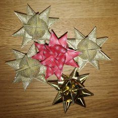 Papirstjerner av papirstrimler kan brukes som borddekorasjon eller henges på treet. Eller pynte en gave?