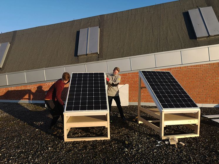 Teknisk museum stiller taket til disposisjon for mulig innovasjon innen solcelleteknologi. Her løfter student Aubell på plass panelene sammen med museets driftsleder, Thomas Ruud