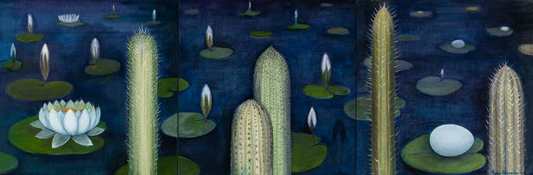 — Jeg arbeider med olje på lerret, i tynne, nesten transparente lag. Motivene er enkle objekter fra hverdagslivet, som jeg bruker for å uttrykke menneskelige relasjoner og følelser. En vekst er ikke bare en vekst i bildene mine, men kan være et symbol på selve livet. Fargene er også viktige komponenter til å uttrykke og understreke symbolikken i bildene.
